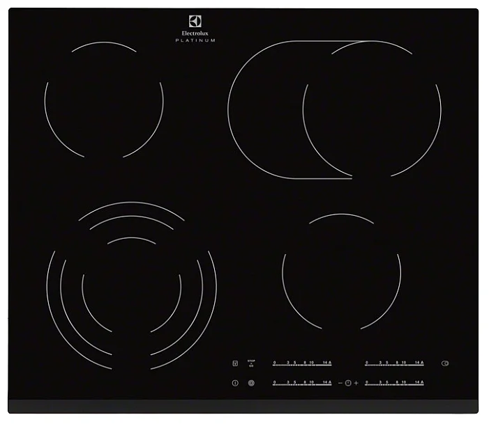 - Нижняя левая и верхняя правая конфорки имеют расширенную зону нагрева. У первой (трёхконтурной) изменяется диаметр, который позволяет использовать большие кастрюли и сковороды. У второй зона становится овальной. Она подходит для гриля, поддонов и утятниц.