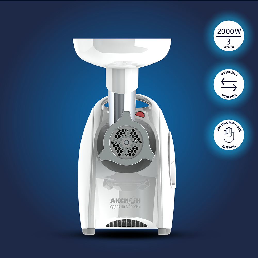 Электрические мясорубки М641 «Аксион» мощностью 2000 Вт позволят вам изготовить до 3 кг фарша в минуту. Новая конструкция шнековой камеры, решетки увеличенной толщины и нож из нержавеющей стали гарантируют высокое качество переработки продуктов даже низкого сорта.