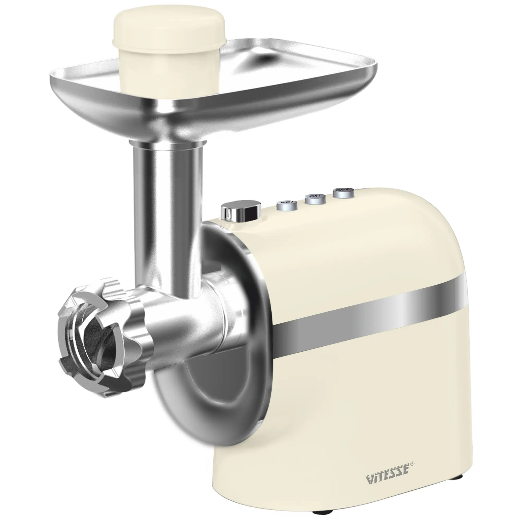 МЯСОРУБКА электрическая Номинальная мощность 400 Вт Мощность блокировки вала 1200 Вт Функция реверса Материал корпуса - пластик +нерж.сталь Материал ножей - металл Материал шнека - металл Материал лотка - алюминий Современный дизайн Переработка до 2 кг мяса в минуту Количество режущих решеток для фарша - 3 (крупный, средний и мелкий помол) Насадки для приготовления колбасок и «кеббе» (2 шт) Толкатель для продуктов с отсеком для хранения насадок Прорезиненные (нескользящие) ножки Питание: 220-240 В ~50/60 Гц