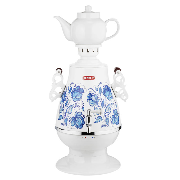 Самовар Centek CT-0091 – оригинальное, качественное и надежное изделие объемом 4 литра и мощностью 2100 Вт, которое кипятит воду за несколько минут. Скрытый нагревательный элемент дает ряд весомых преимуществ перед моделями с открытой спиралью. К ним относятся: увеличенная теплоотдача, более быстрый нагрев воды и меньшая склонность к образованию накипи. Корпус и крышка выполнены из высококачественного материала. Удобные ручки самовара не перегреваются и не скользят в ладонях во время использования. Кран на корпусе самовара обеспечивает удобное переливание воды. Плотно прилегающая к корпусу крышка обеспечивает герметичность при закипании. Керамический заварочный чайник объемом 1 литр дольше сохраняет тепло. Съемный фильтр для заварки в комплекте. Предусмотрена функция поддержания температуры. Благодаря функции автоматического отключения вам не нужно находиться рядом с прибором во время его работы. Защита от включения без воды предупреждает поломку. Удобная кнопка включения и устойчивые ножки для комфортного и безопасного использования. LED-индикаторы работы и нагрева. Корпус с авторским дизайном. Самовар Centek CT-0091 создан для душевного чаепития в большой семье.