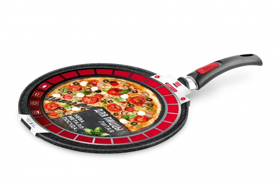 Литая сковорода для пиццы оптимального размера 32см с невысокими скошенными боковым стенками. Съёмная ручка и низкие борта делают процесс приготовления пиццы дома максимально комфортным и простым. Легко аккуратно выложить тесто на сковороду и распределить начинку. Съемная ручка имеет надежный и удобный механизм: помещая пиццу в духовку, снять и надеть ручку можно одной рукой. Утолщенное дно обеспечивает особые термоаккумулирующие свойства, благодаря чему пицца равномерно пропекается и красиво румянится. Антипригарное покрытие отлично выполняет свою функцию: тесто не пристаёт, легко и удобно сервировать готовое блюдо к подаче на стол - пицца с минимальной помощью перемещается на блюдо.