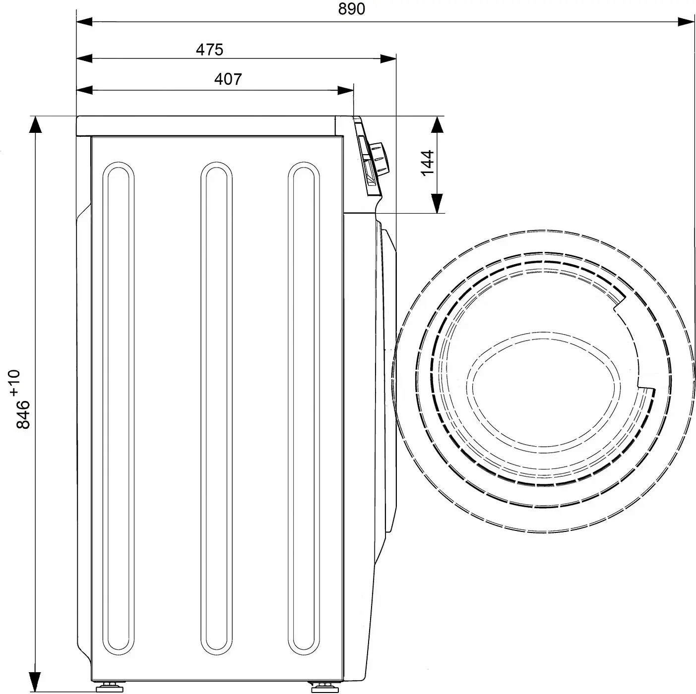 Глубина по панели управления с учетом кнопок и ручек